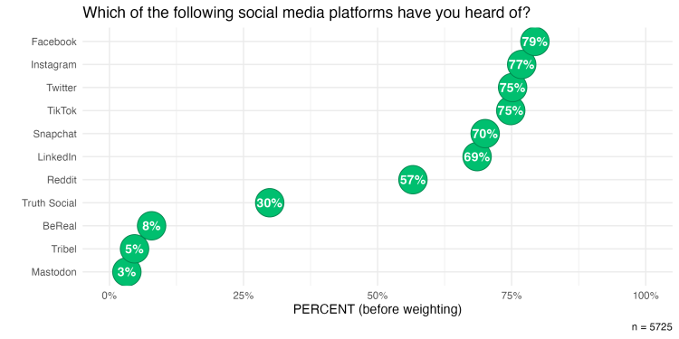 In this study, respondents are asked, among other things, their familiarity with and usage of different social media platforms. One of the key results in this study is the percentage of respondents who have heard of each social media platform, which we can see in the chart below.
