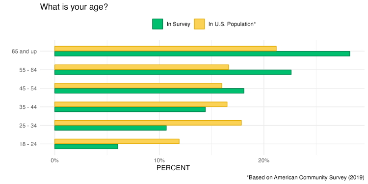 Digging a little bit deeper into the demographic composition of our sample, we can see one potential issue: our sample skews on the older side. Below is a comparison of our respondents’ age breakdown (in green) with the broader US population (in yellow). It’s clear that our sample is not representative of the US consumer population as a whole: the median age in our sample is 54, while the median age in the US is closer to 38!