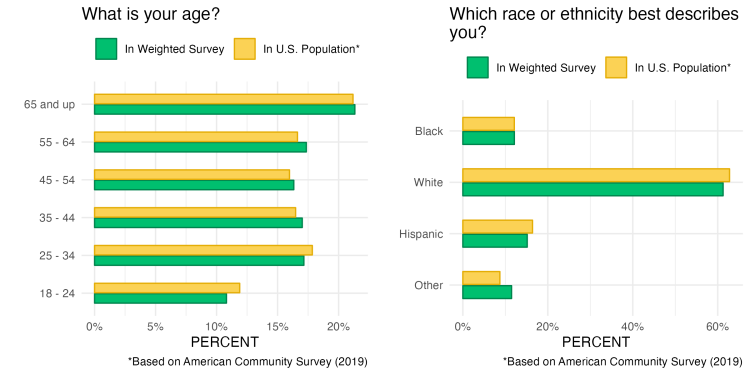 We can see that after applying our weights, the age and race distributions of our respondents do more closely approximate the US population than they did before.