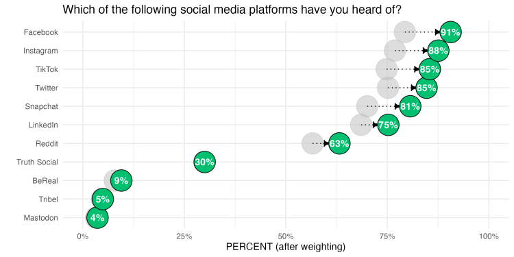 What does our weighted (corrected) survey now tell us about social media familiarity? We can see from the chart below that 91% of US adults have heard of the most popular social media platform, Facebook, as compared to closer to 80% before weighting.
