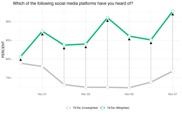 Remember that this study is technically a brand tracker. Zeroing in on just one brand, we can see below that weighting helps correct brand familiarity over time. Instead of a dip in brand familiarity, familiarity with TikTok has largely increased over the period of our study with some cyclical trends throughout the week according to the weighted survey.