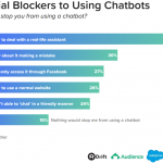 Preferring a real-life assistant (43%) is the most frequently mentioned barrier to using chatbots, and worry about the chatbot making a mistake (30%) led a second tier of concerns. Understanding the issues that might stop consumers from using a new technology is a valuable result of research into a product or idea.