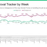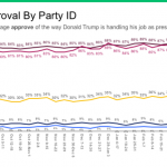 These subtle shifts show up when we plot Trump’s approval by party identification, although the partisan polarization about Trump is so pronounced – with 80 percent or more of Republicans consistently approving compared to less than 10 percent of Democrats – that it can be hard to see trends over time.