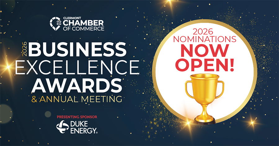 The awards will be presented during the Clermont Chamber's Annual Meeting on Friday, February 20, 2026, 11:30 am-1:30 pm, at the Oasis Conference Center in Loveland. Our region's leaders will gather together to salute the best of our region's many outstanding businesses and individuals.