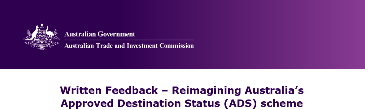 The Australian Trade and Investment Commission (Austrade) recognises the importance of engaging with industry, governments and broader community stakeholders, to shape the future of the Approved Destination Status (ADS) scheme. To guide feedback, please refer to the ADS framework discussion paper, Reimagining Australia's Approved Destination Status (ADS) Scheme. The discussion paper provides an overview of the context in which the scheme operates and some of the key issues identified with regards to the scheme.Have your sayYour feedback will inform the future direction of the ADS scheme.The written feedback period closes at 5pm AEDT on 27 March 2026. Feedback received after the deadline may not be considered.If you have any questions about this consultation process, please email: ADSconsultation@austrade.gov.au Next