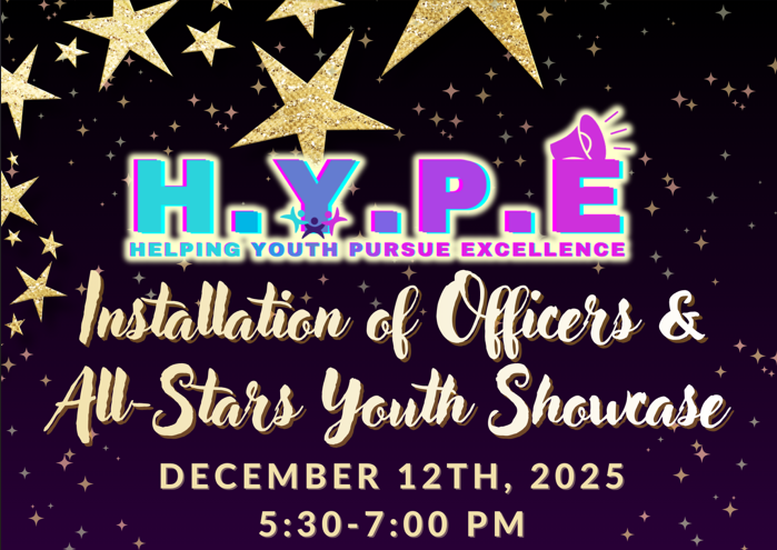 We are proud to announce this upcoming H.Y.P.E Installation of Officers & All-Stars Youth Showcase for H.Y.P.E Youth Members to showcase and celebrate their achievements.