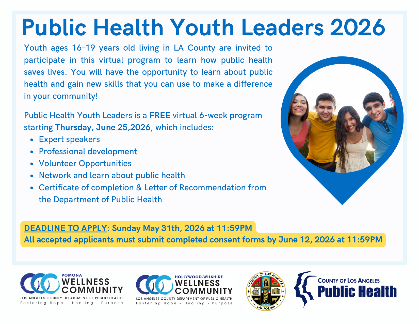 Youth ages 16 - 19 years old currently living in LA County are invited to apply to this program to learn how public health can save lives. Gain knowledge about public health and new skills that you can use to make a difference in your community!