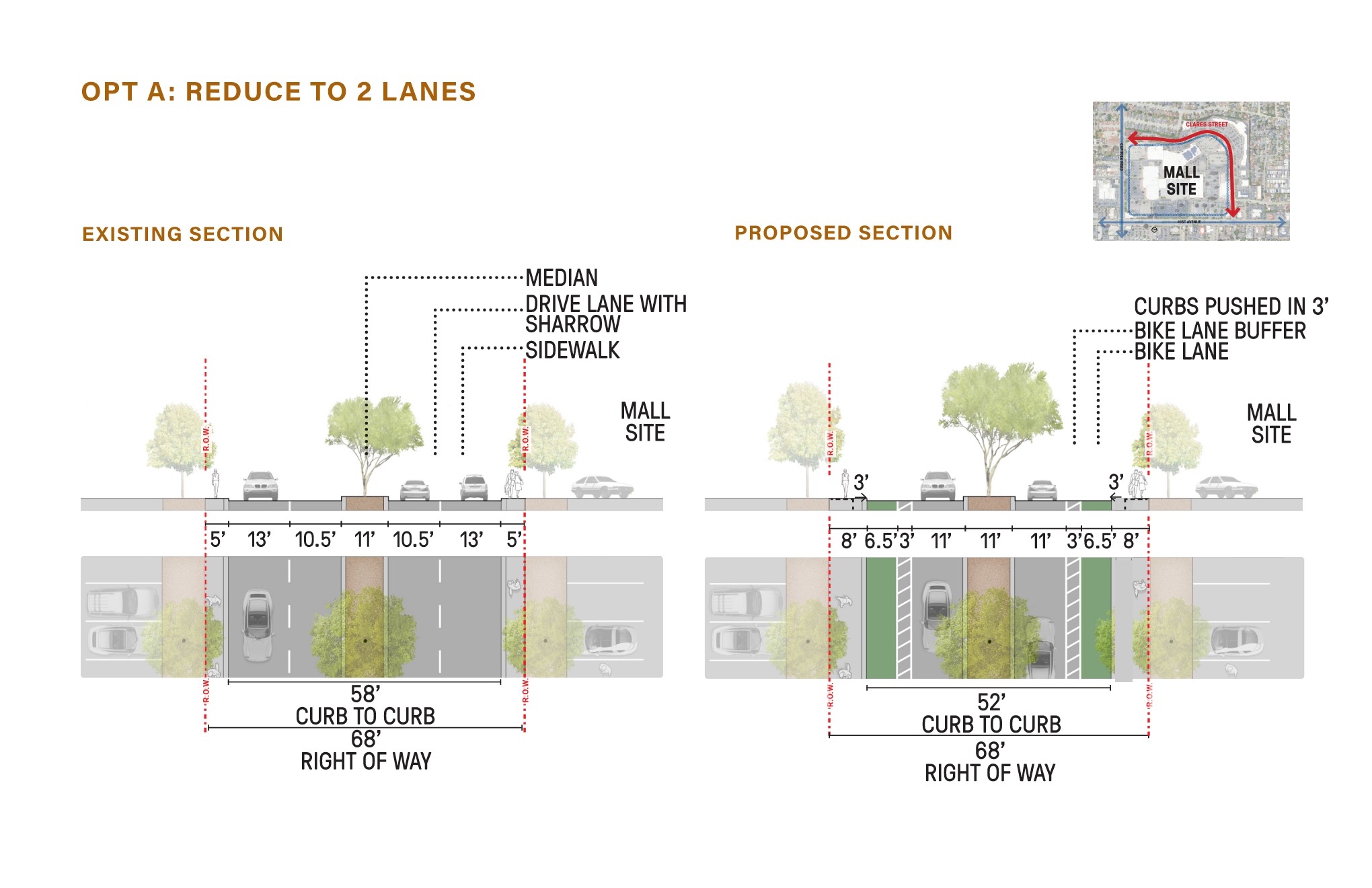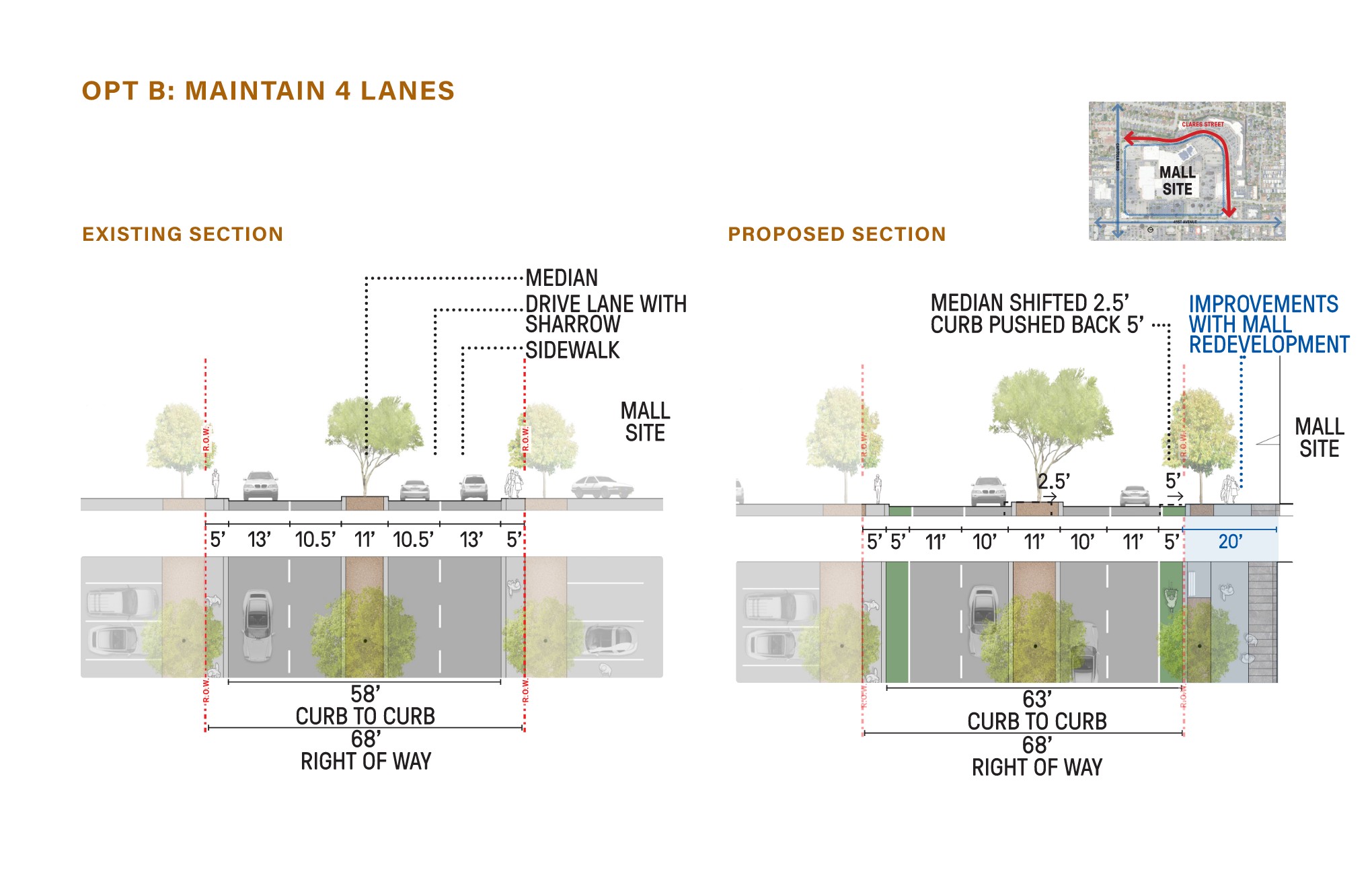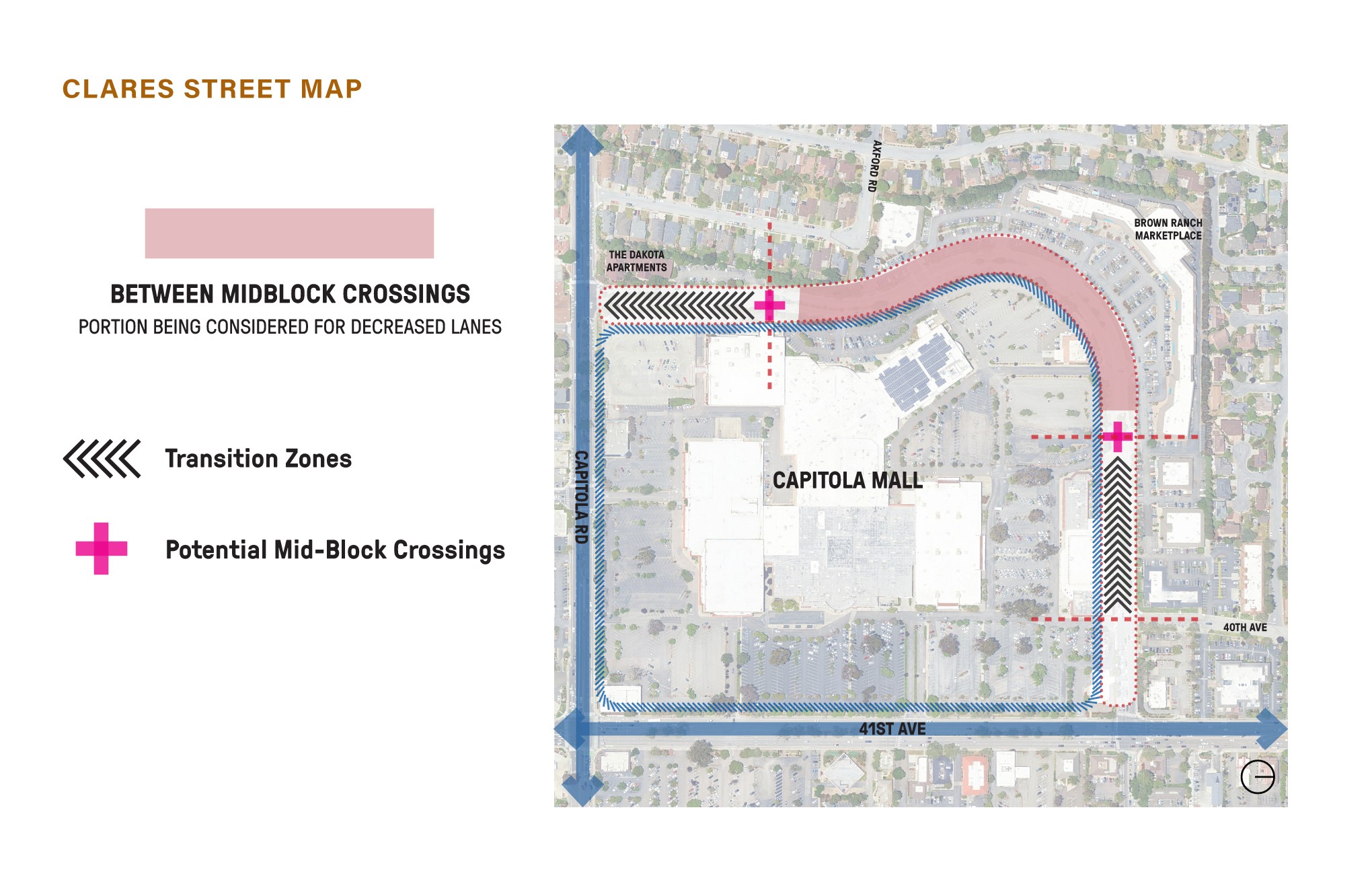 The Corridor Plan for 41st Avenue, Clares Street, and Capitola Road envisions a safe, inclusive, and vibrant street network that reflects Capitola’s identity, supports all travel modes, and fosters local business and community. The Plan will provide guidance for future improvements to Clares Street, 41st Avenue, and Capitola Road. These three corridors surround the current Capitola Mall site and serve as important thoroughfares for the City of Capitola today.