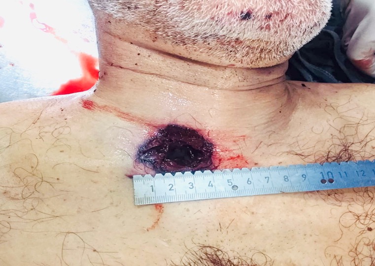 External examination revealed a single, well-circumscribed penetrating wound in the right suprasternal region, measuring approximately 4 × 4 cm, with darkened margins and without soot deposition or stippling (see autopsy photo). No additional penetrating injuries were identified, and there was no exit wound.