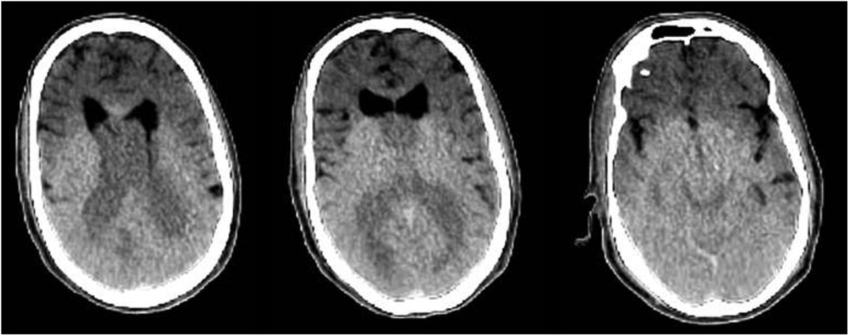 2. A 70-year-old male with a history of bilateral hand arthritis was discovered unresponsive outside his residence during a wellness check. Postmortem computed tomography (PMCT) images of the brain are provided (figure 2).