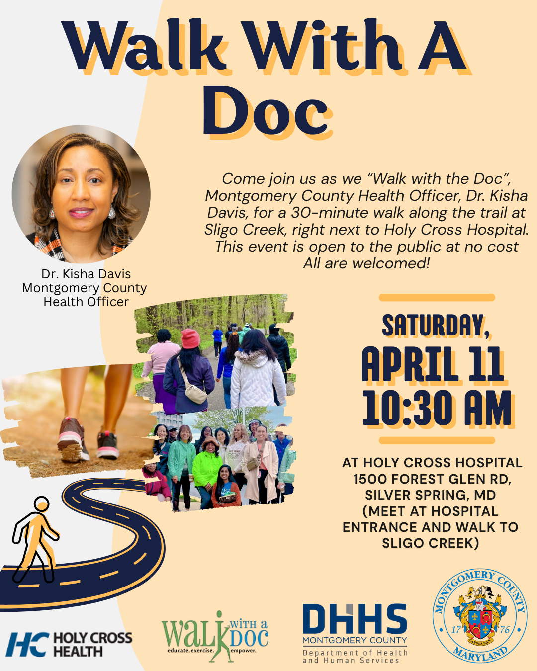 Join us as we "Walk with the Doc", Montgomery County Health Officer, Dr. Kisha Davis! This event is free and open to the public. For planning purposes, registration is encouraged, but not required.