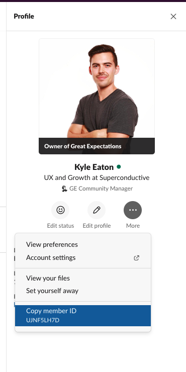 How to find your Slack ID after clicking on your name and viewing your profile.