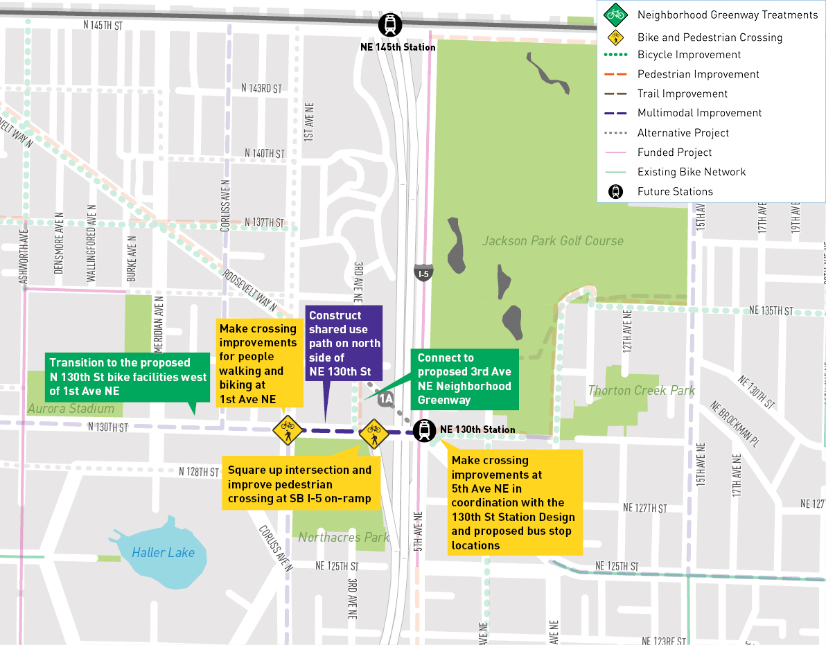- Make crossing improvements for people walking and biking at NE 130th St/1st Ave NE and connect to proposed bike facilities west of 1st Ave NE