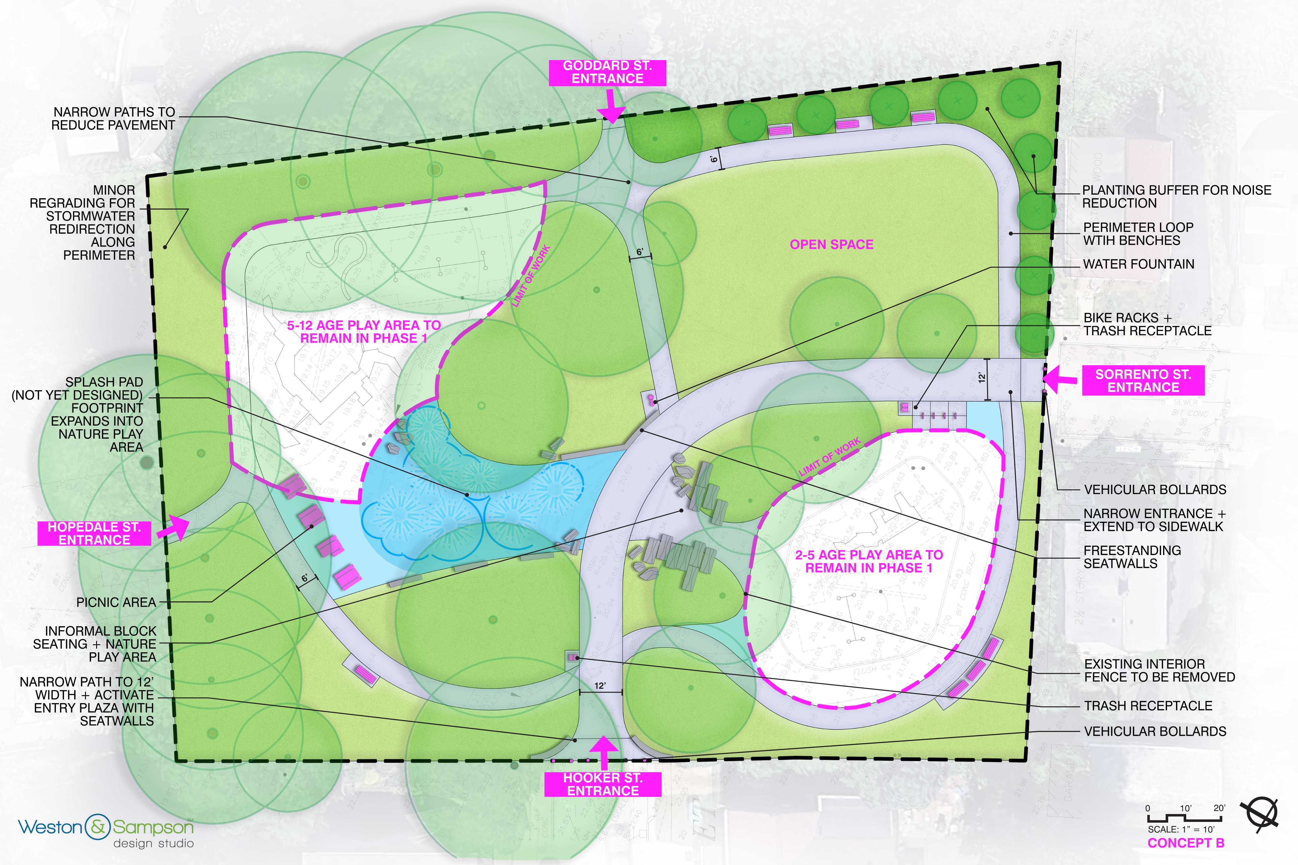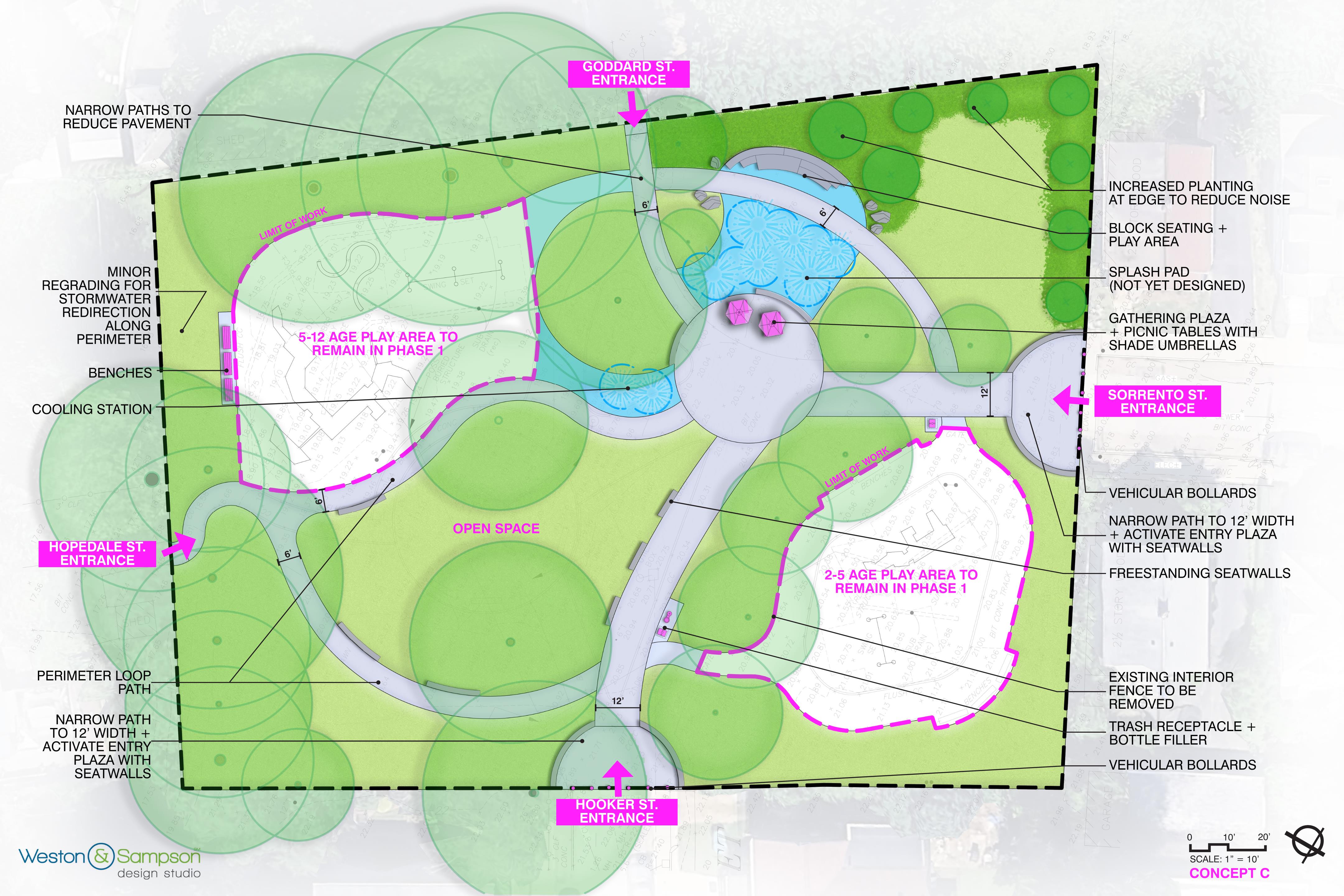 On February 23, Parks held an online community meeting to discuss three potential concepts for the park (shown below). To hear each alternative described in detail, please visit the project page (boston.gov/departments/parks-and-recreation/project/james-h-roberts-playground-improvements) for the video of the presentation from Meeting No. 2.