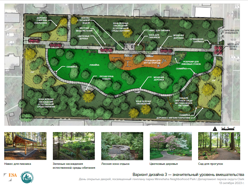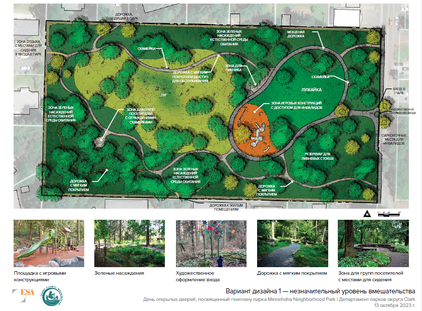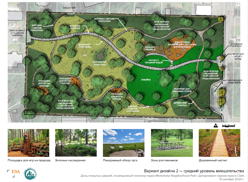 В начале этого года компания Parks and Lands провела день открытых дверей и опрос населения относительно будущего развития территории парка в районе округа Миннехаха, расположенного на Northeast 17th Avenue, к северу от Northeast Minnehaha Street. На территории площадью пять акров будет разбит районный парк, который станет местом отдыха горожан, проживающих в радиусе полумили от него. Сотрудники изучили предложения сообщества и подготовили к рассмотрению перечисленные ниже варианты. Ответы на эти вопросы будут учтены при разработке сотрудниками проекта предпочтительного генерального плана для последующего утверждения Советом округа Кларк.