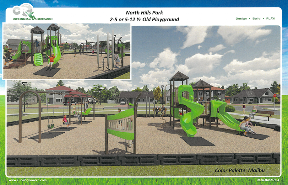 The current North Hills Park play structure was damaged beyond repair. The play structures below meet the required specifications for all newly installed play structures. The goal is to gather input from the neighborhood to allow for the purchase and installation of a new play structure.