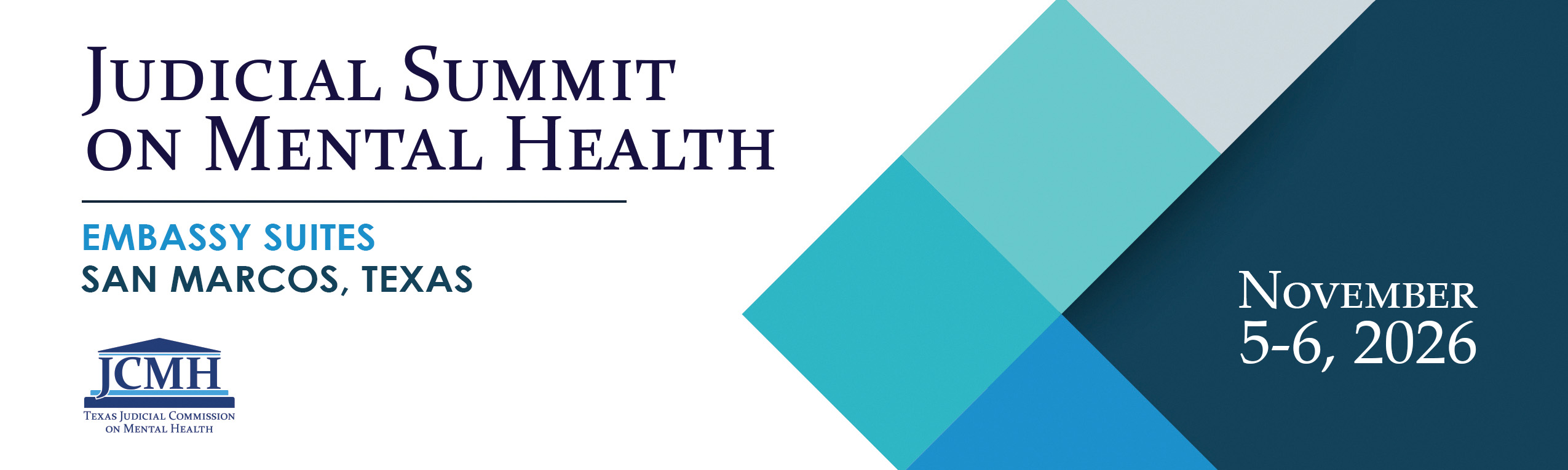 The Texas Judicial Commission on Mental Health (JCMH) will host its 9th Annual Judicial Summit on Mental Health on November 5–6, 2026, at the Embassy Suites in San Marcos, Texas. The Summit will be offered in both live and virtual formats; however, speakers must attend in person. More than 500 in-person attendees and 1,000 online attendees are anticipated.