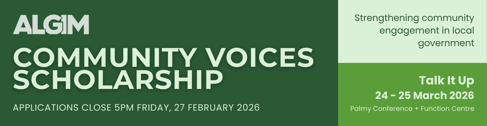 ALGIM is offering three Community Voices Scholarships for local government professionals to attend Talk It Up 2026 in Palmerston North.