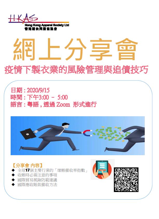 本會 誠邀貴公司參與 <疫情下製衣業的風險管理與追債技巧- 網上分享會>。