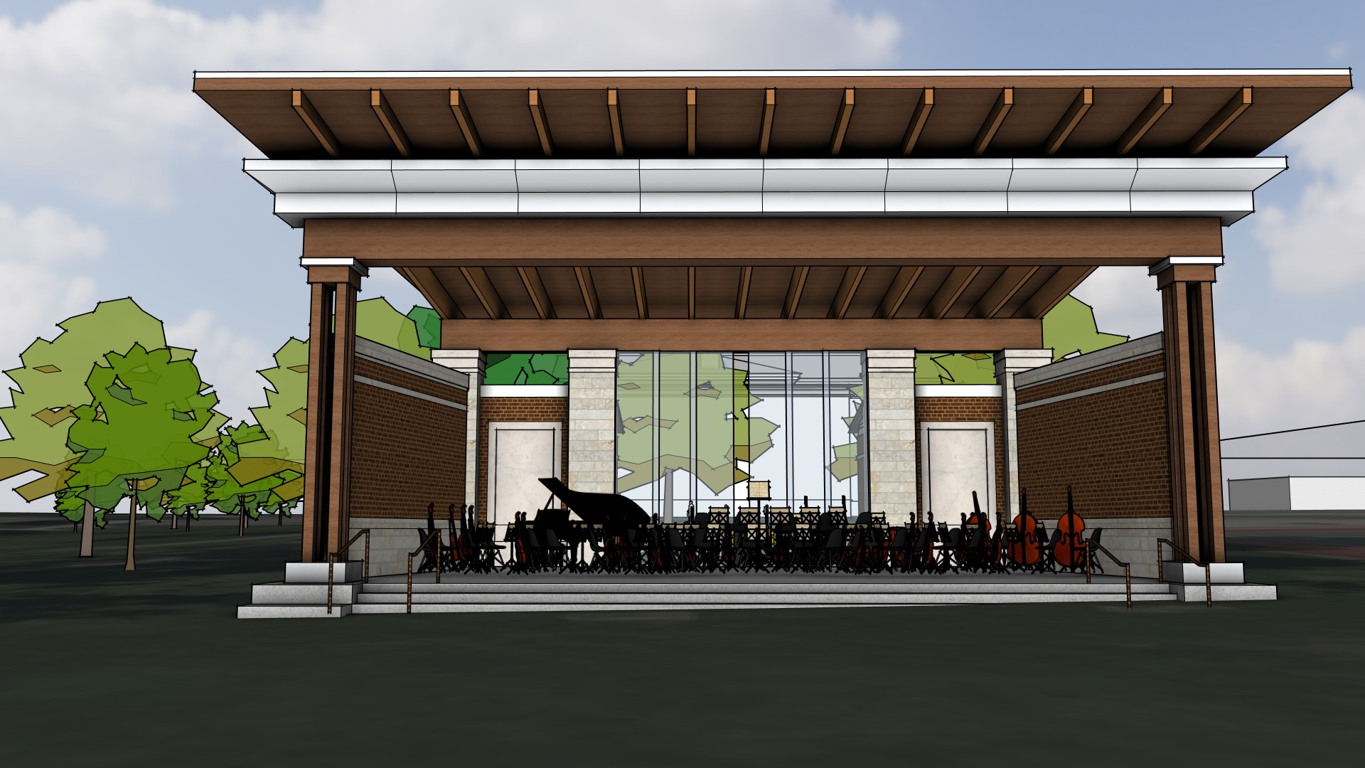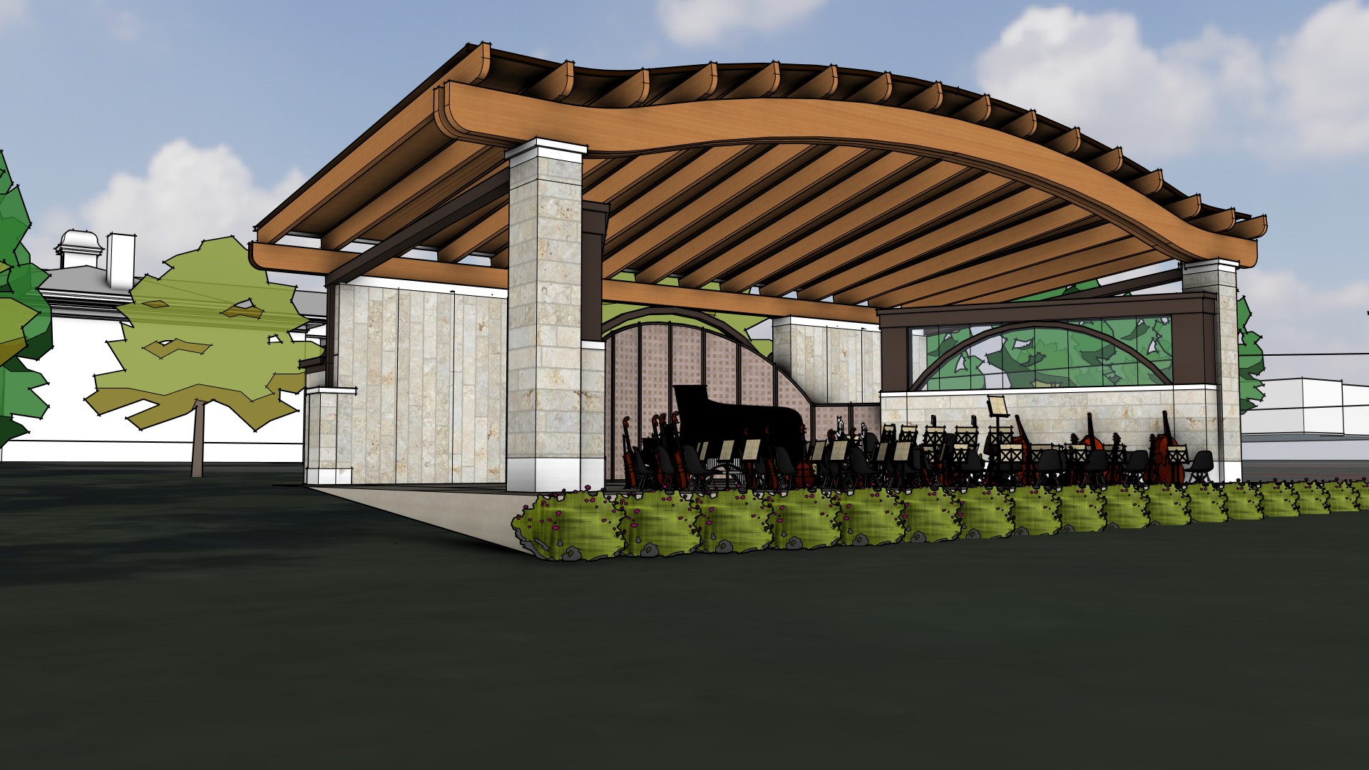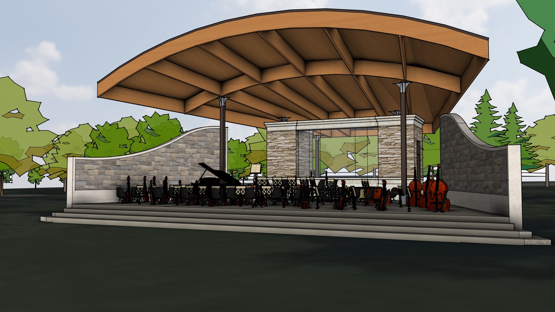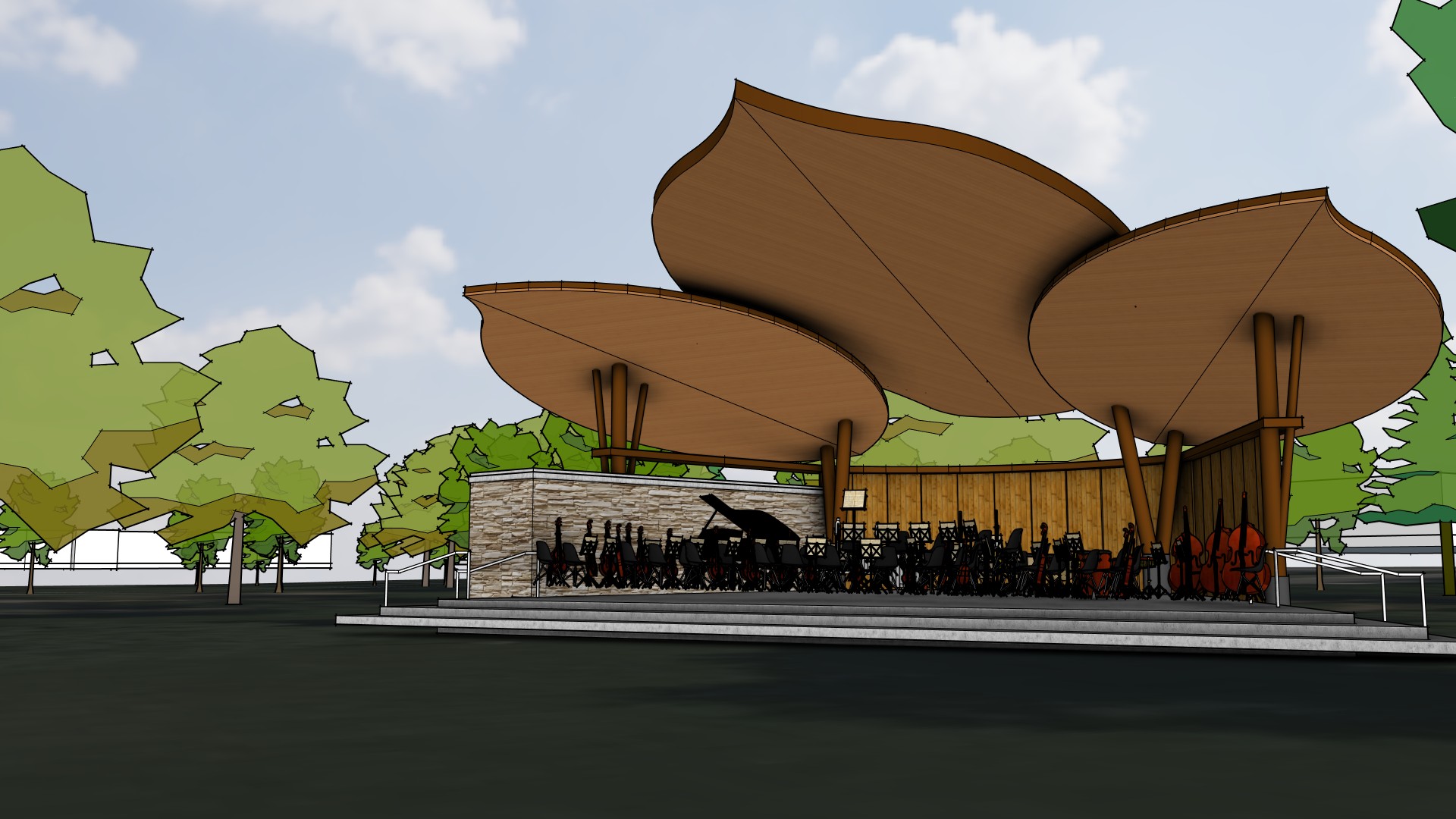 Multiple improvements to Wilder Park are being proposed shown across two concepts, some additional opportunities and four bandshell designs. Each concept includes a new bandshell location and permanent restroom building, funded by the referendum, along with a variety of improvement options for Wilder Park. The proposed bandshells are approximately 60' wide at the front, 40' wide at the rear, 40' deep from the front to the rear and 24’ high from the stage to the canopy.
