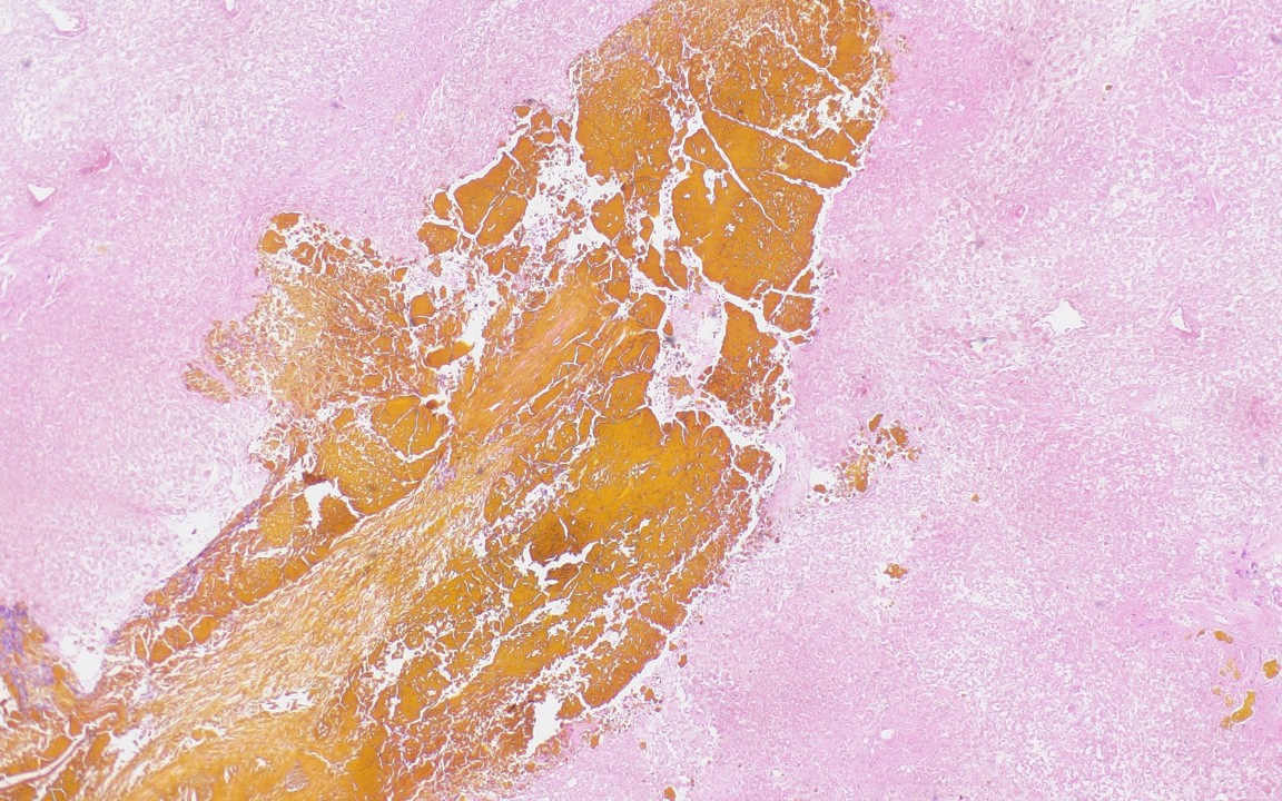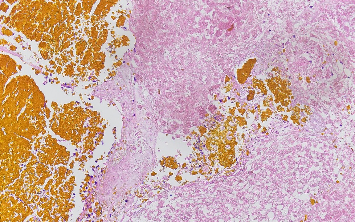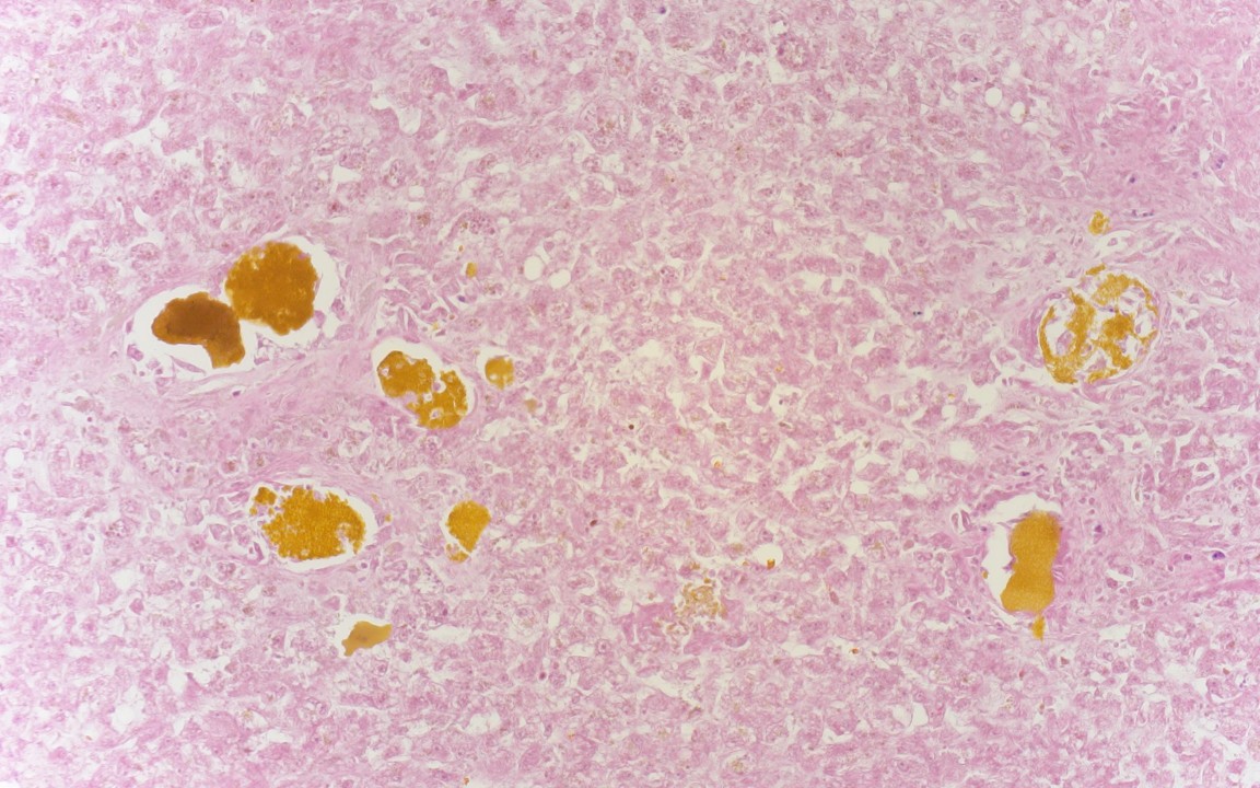 Autopsy was remarkable for scleral icterus, anasarca, and jaundice. Grossly the liver was golden-brown and weighed 2525 grams (normal 1000-1800) with numerous intraductal lesions present throughout the cut surface (cross section shown, black arrows). Histology of the liver was remarkable for acellular golden-yellow pigmented material throughout the large and small duct system with flattened biliary epithelium and marked background liver necrosis (images shown). No significant inflammation, fibrosis, passive congestion, hepatocyte ballooning/degeneration, or definitive eosinophilic cytoplasmic inclusions were identified.