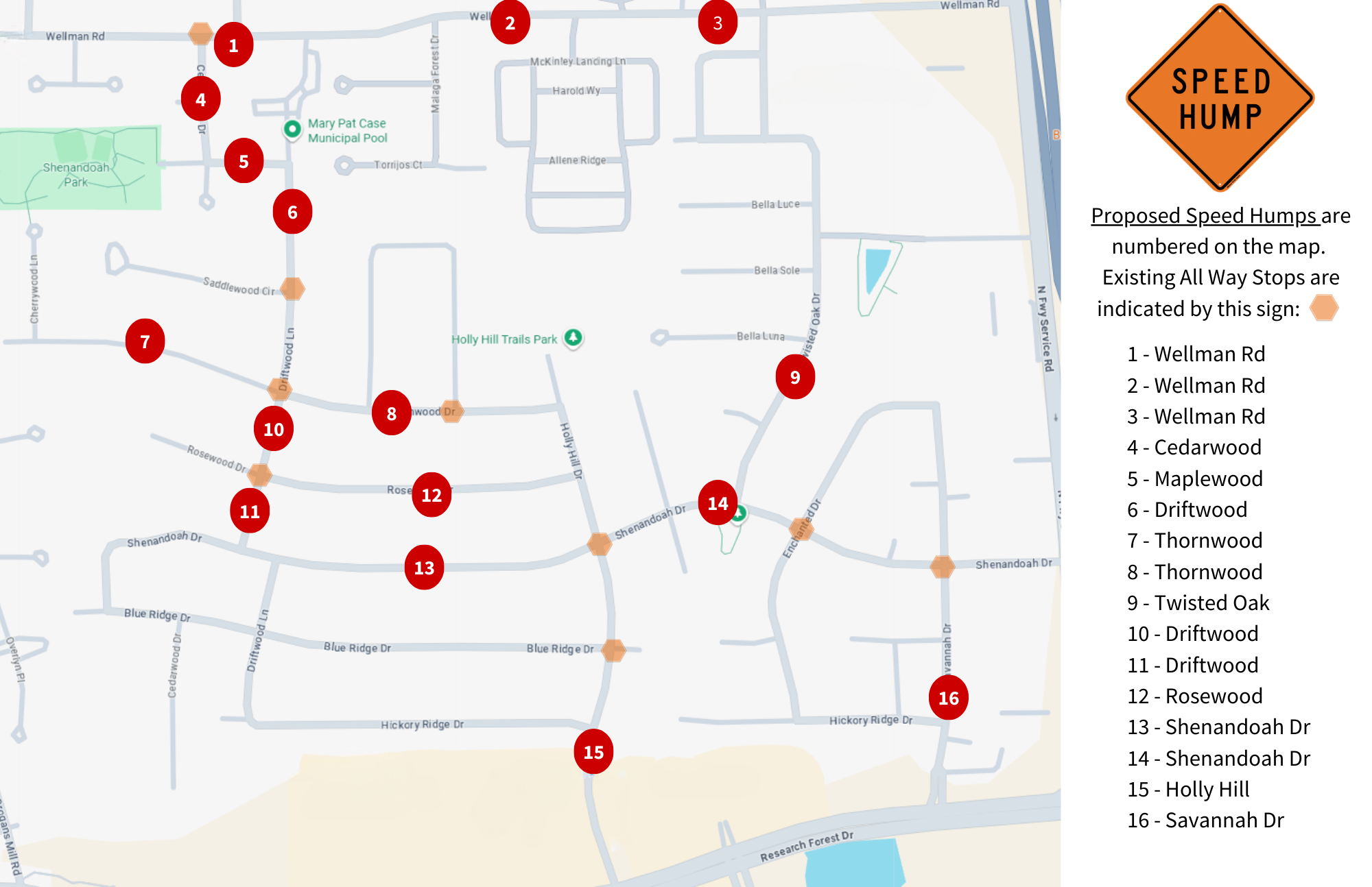 The City is seeking resident input to address traffic concerns in the Shenandoah Valley neighborhood. Please answer the questions below regarding stop signs, speed humps, and traffic calming devices.