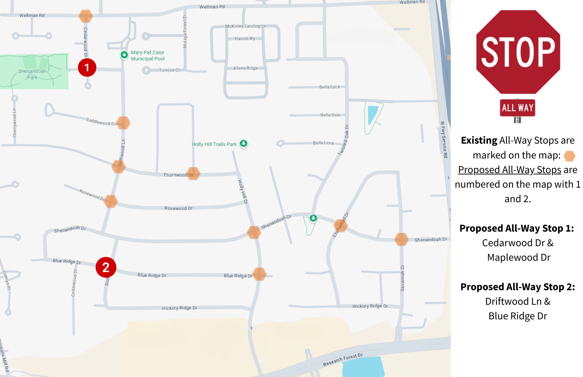 The map above proposes additional All-Way Stop Signs. Select all of the locations where you would support adding All-Way Stop Signs, or choose