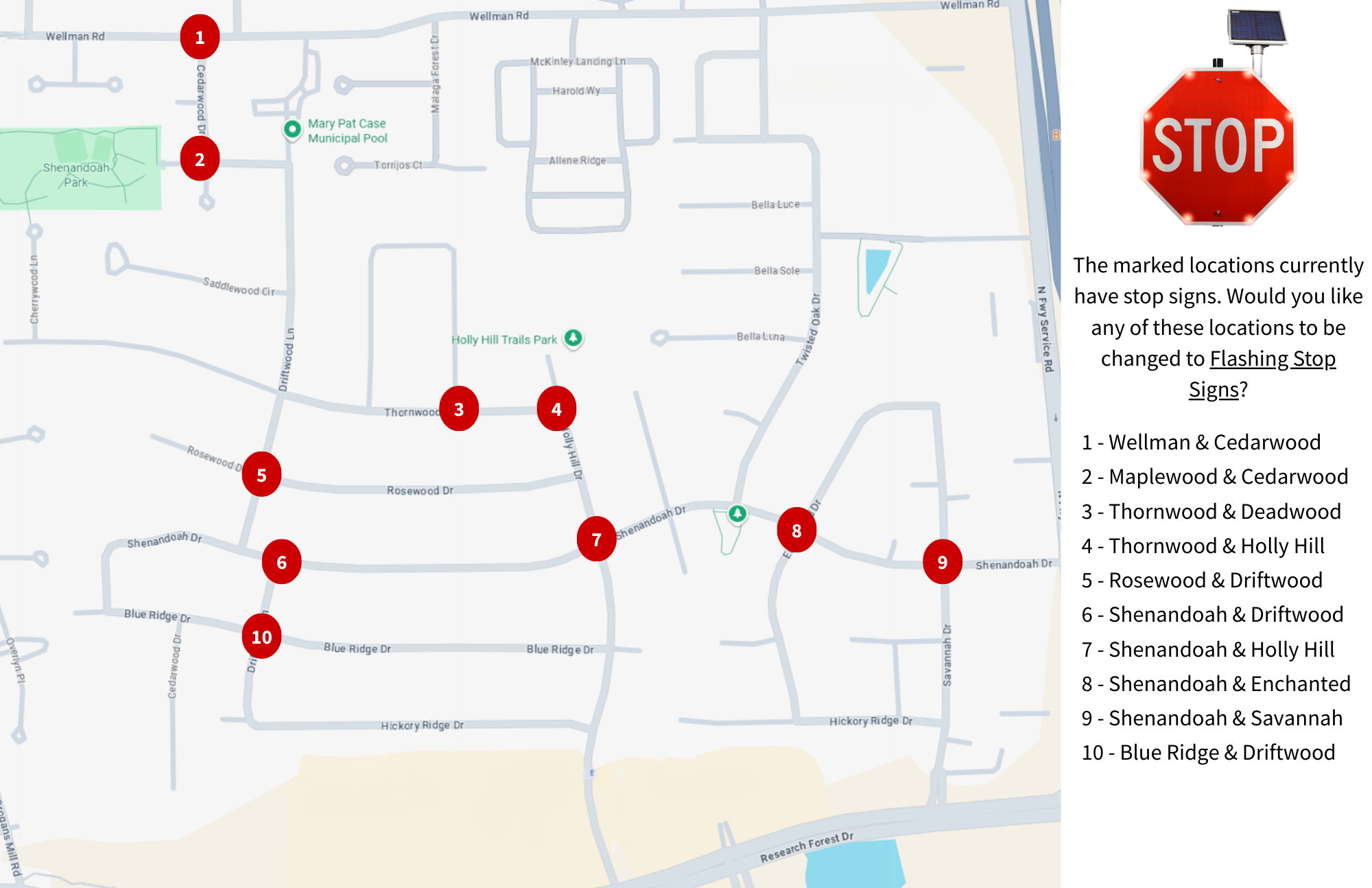 stop signs. Select all of the locations where you would support adding Flashing Stop Signs, or choose