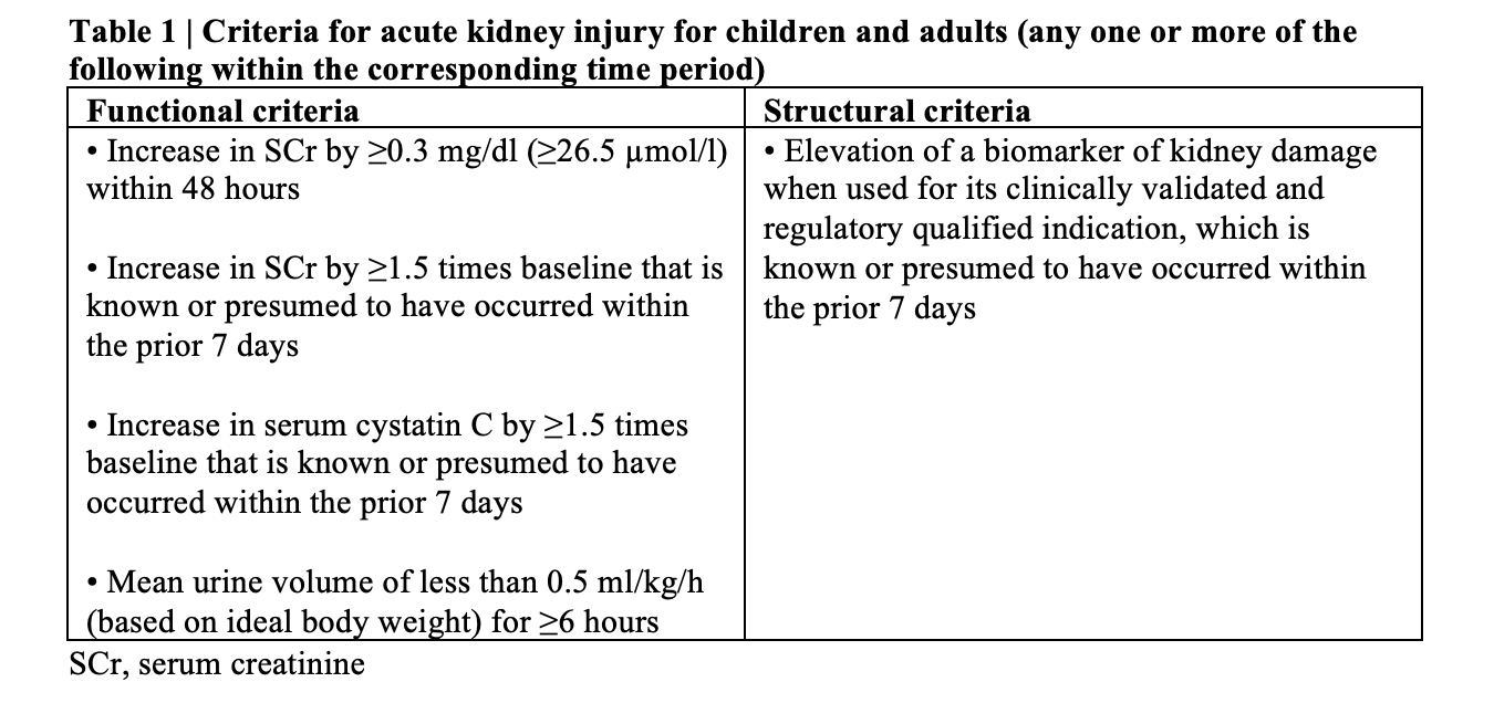 Practice Point 1.1.1: Acute kidney injury (AKI) in children and adults is defined by the presence of one or more abnormalities of kidney function or structure known or presumed to have occurred within up to 7 days, in the appropriate clinical context (Table 1).