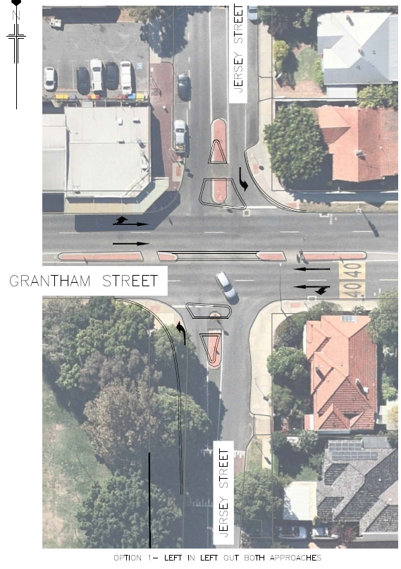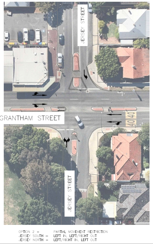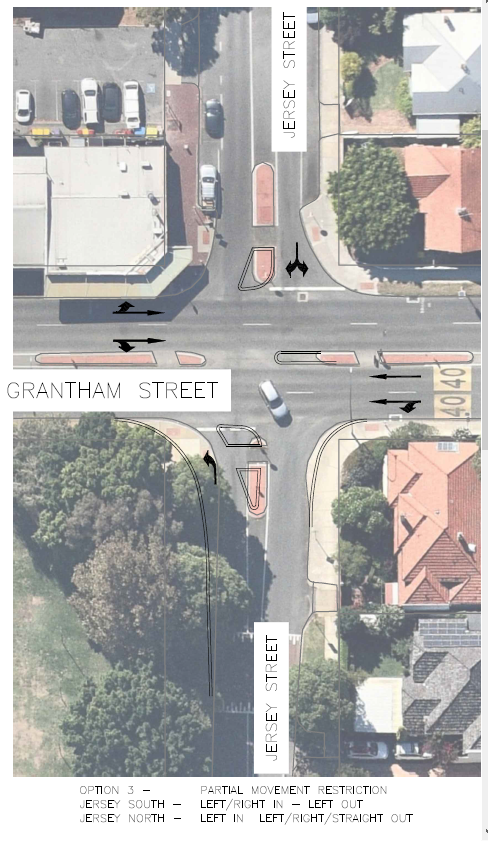 This intersection has seen a number of crashes each year and meets the criteria required as a Black Spot. To lower number and severity of these crashes, an application for black spot funding was made to Main Roads Western Australia (MRWA) to modify both Pangborne and Jersey Street intersections to restrict some right turn and cross traffic flows as per Image 1 below.