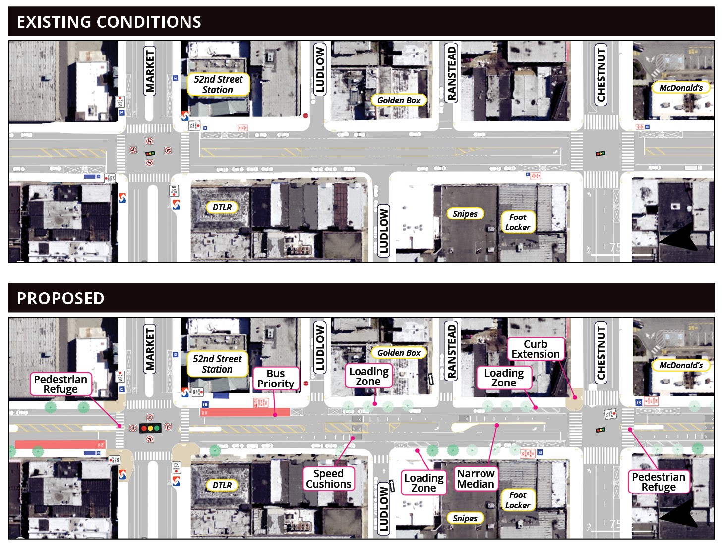 The 52nd Street Commercial Corridor Improvement Project is a partnership between the City, The Enterprise Center CDC, and community stakeholders. The limits of the project are from Arch Street to Pine Street. The goals of this project are to improve transit service, increase pedestrian safety, reduce serious crashes, and make 52nd street safer, cleaner, and greener corridor for all.