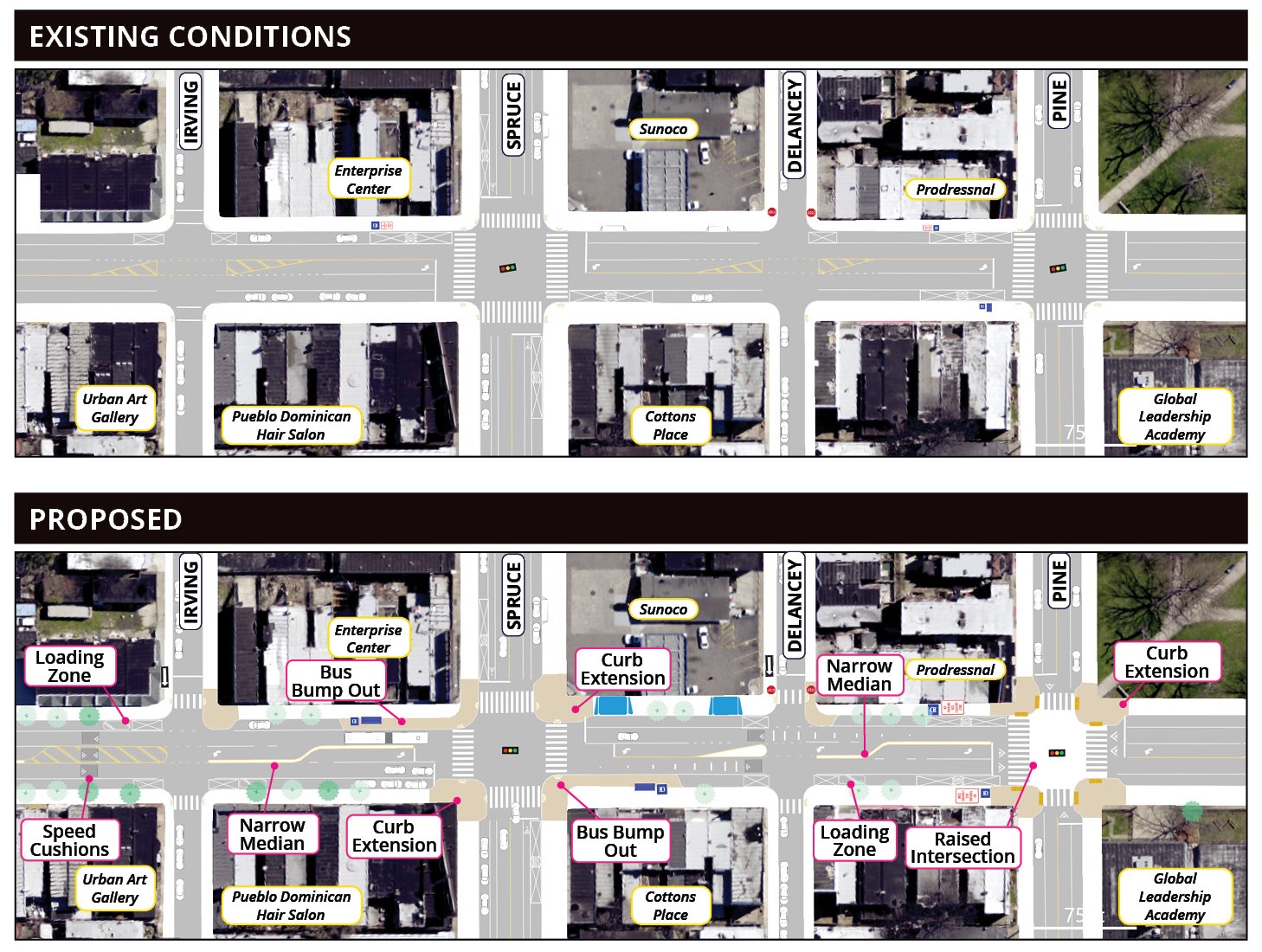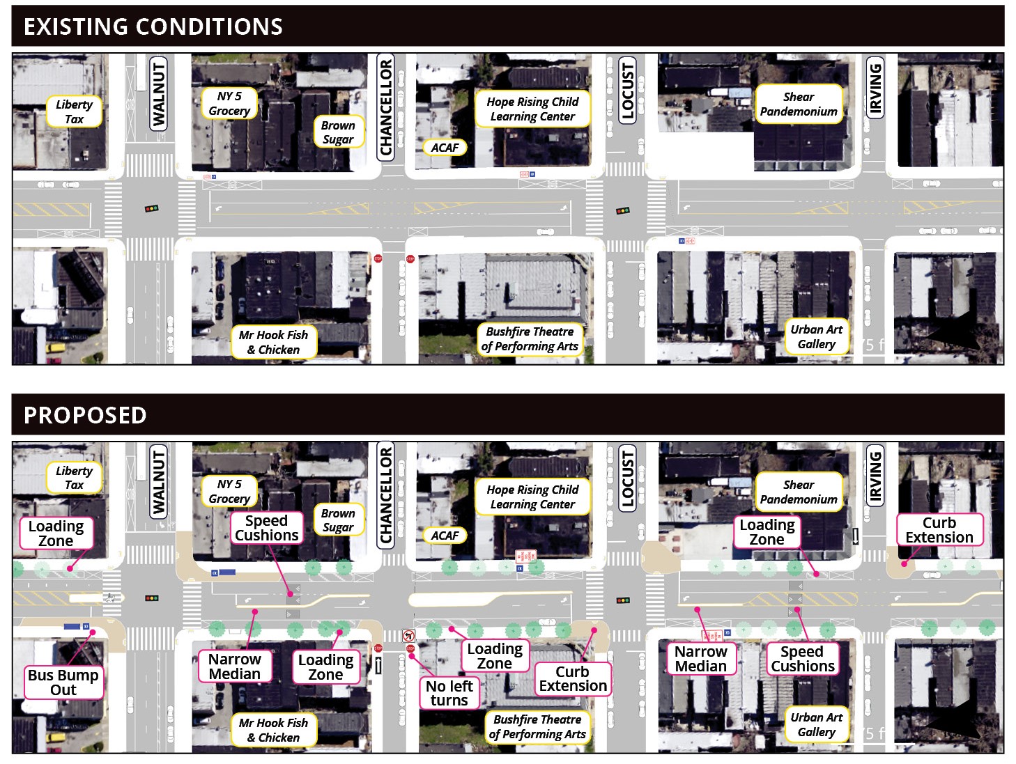 This survey shares traffic safety data, design solution toolbox, and what we have heard so far from the community from the first round of engagement. The proposed design walks through detailed changes for each block on the corridor followed by a short survey asking your input about the proposals.