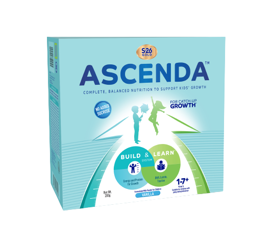 * S-26® Gold ASCENDA™ is scientifically formulated to support catch-up growth for children falling behind the growth curve or are taking insufficient nutrients due to picky eating behaviour.