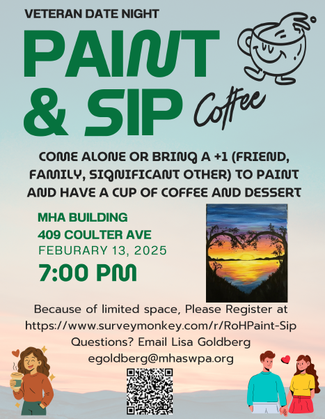 Are you or someone you know a Veteran? Join us for a fun evening of Painting, Sipping (coffee and non-alcoholic beverages) and Dessert! Come alone or bring a plus one - friend, family, or significant other. Natalie Trifiro will lead the group in painting the beautiful painting below. No painting experience or artistry needed! This is a free event for veterans to connect with family or friends! Please contact Lisa Goldberg at EGoldberg@mhaswpa.org for more information.