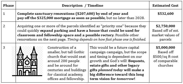 For the future, the surveys indicated the most important priority was to acquire more property for additional parking, classroom space, etc., and a possible Gothic “landmark” church in the future. To plan for both our short and long term goals we have broken our goals and estimated costs into three phases: