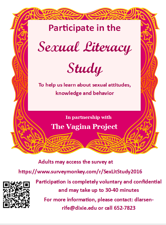 If you have questions or want a copy or summary of this study’s results, you can contact the researcher at dlarsenrife@dixie.edu. If you have any questions regarding: (1) the conduct of the research, (2) your rights as a participant, and/or (3) a research-related injury, contact the Dixie State University Institutional Research Board, Song Gao at (435)652-7598 or by email sgao@dixie.edu. Please feel free to print a copy of this consent page to keep for your records.