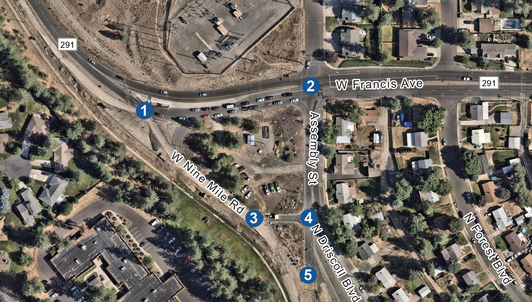 The City of Spokane is studying potential safety and operational improvements at the Francis Avenue, Assembly Street, and Driscoll Boulevard intersections in northwest Spokane. These intersections serve as a key access point to State Route 291 (Nine Mile Road) and nearby neighborhoods. Utility upgrades are also planned in the area, creating an opportunity to make intersection improvements at the same time.