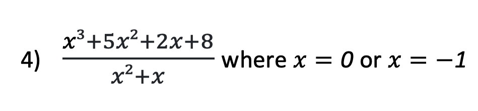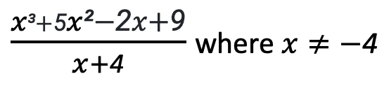 Long Division of Polynomials Quiz Question Title * 1. Solve: x+1 x−1 x−6 x+6 Question Title * 2. Solve: x² + 5x + 2 x² + 5x - 9 x² + x + 6 + (9)/(x+4) x² + x - 6 + (33)/(x+4) Question Title * 3. Solve: x² + x − 6 x²−2x + 3 x² + 2x − 3 x² − 2x − 3 Question Title * 4. Solve: x² + 5x - 9 x² + x - 6 + (33)/(x+4) x² + x + 6 + (9)/(x+4) x + 4 + (-2x+8)/(x²+x) Done