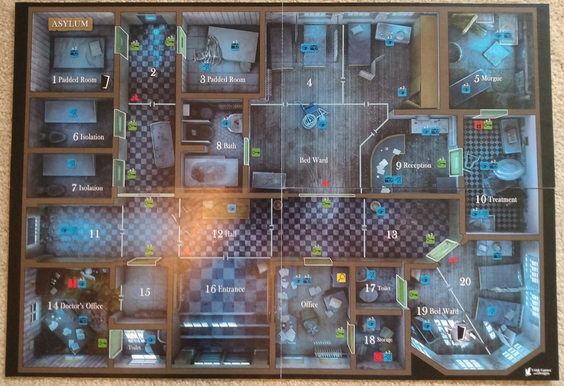 Hello everyone! We just wanted to give a pretty significant update. We are still working on the expansion (more to come in a week or so), but as our units of our original game are being sold, we have to start thinking of our next print run. There will be a few small minor updates in this next print run (rule clarifications, better trim cut for Barricade token, and some other minor changes). However, we were thinking of upgrading the original game board to a larger, quad fold board. This will allow more space to move around in each room, have slightly larger icon sizes (increased 120%, and font size from 10pt to 12pt for x2 and x3 text), and just all around more room to play. This does take up just a bit more space on the table, but it is not overwhelming. Below are picture comparisons of a draft Print and Play copy of the Quad fold Board, alongside the manufactured original.