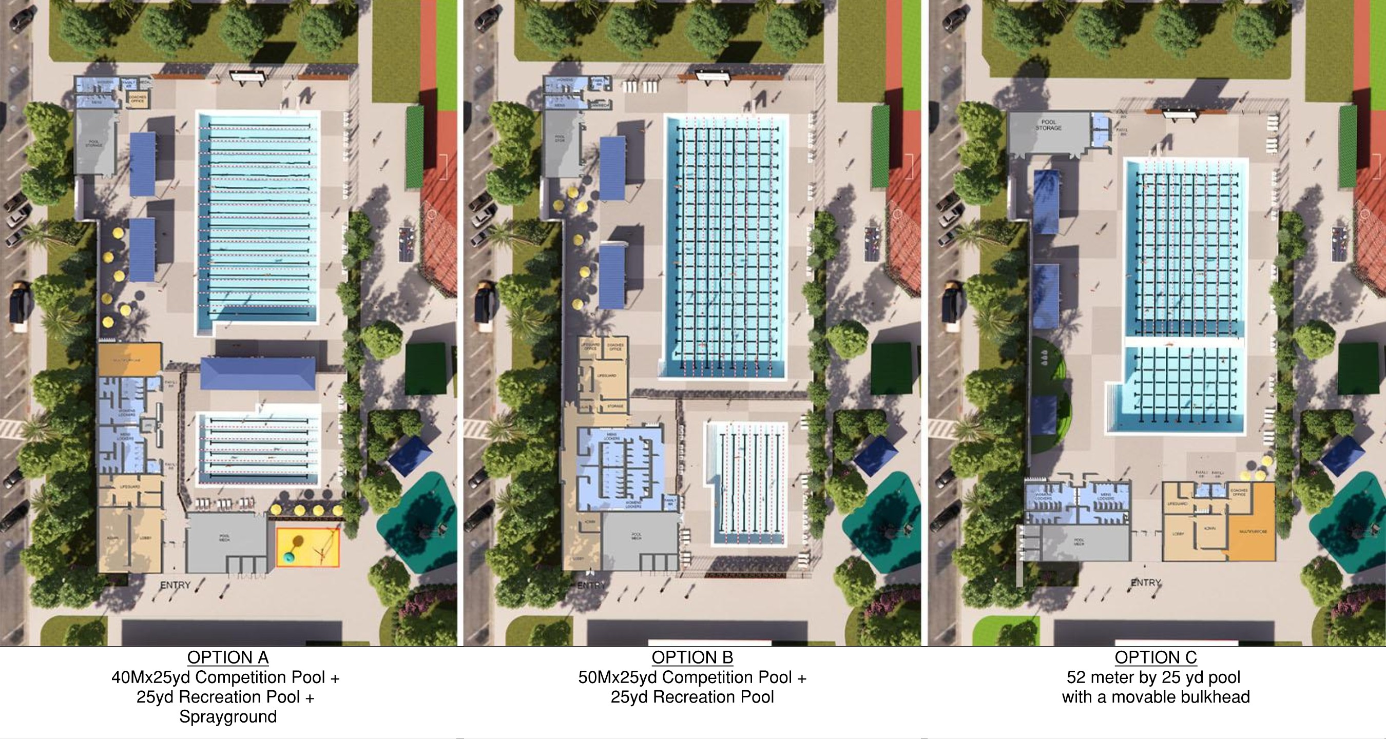 Please note: all options include shade, seating, community room space and support facilities, such as locker and restrooms. The main differences in the designs are the pool sizes and sprayground option.