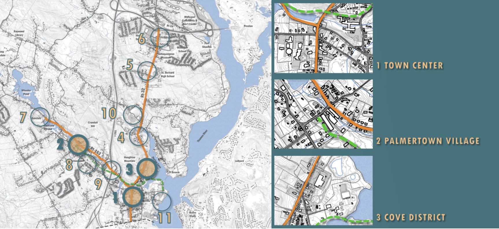 The Town of Montville and its consultant team are developing an Investment Plan to guide future improvements and development along Routes 32 and 163. As part of this effort, we are focusing on three focus areas: Area 1: The Town Center (near Town Hall and the intersection of Route 32 and Route 163), Area 2: Palmertown Village (the area around the intersection of Route 163 and Bridge Street); and Area 3: the Cove District (the area around Route 32 between Crescent Street and Beit Street, near Horton Cove).
