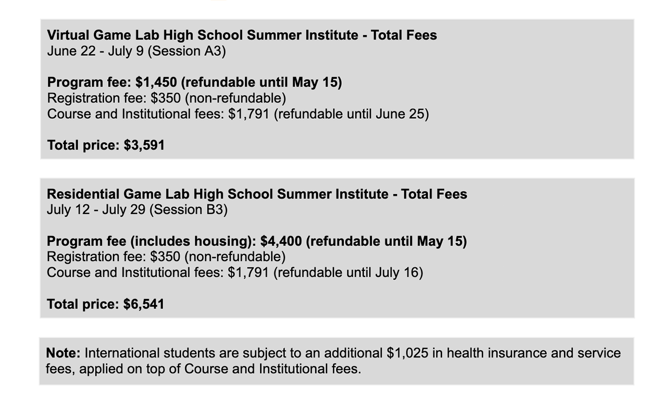 Thank you for your interest in the UCLA Game Lab Summer Institute program! On this site you will begin a multi-step enrollment and payment process for the Game Lab’s pre-college, credit-earning program–starting with the completion of a Program Application and the payment of a Program Fee (a portion of the total enrollment fees required). We hope you will join us for an academically, socially, and creatively enriching summer!