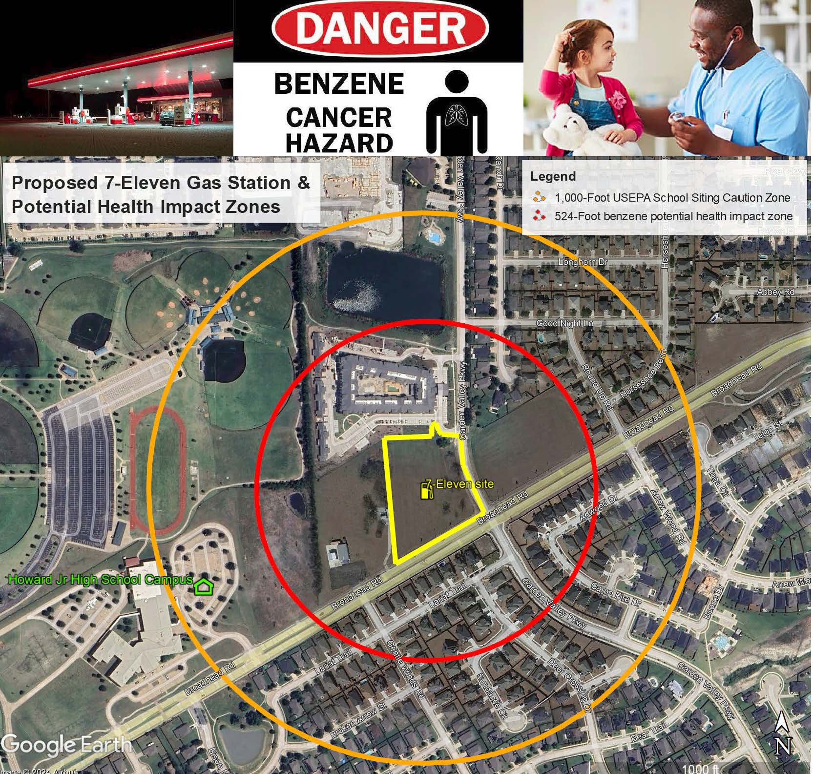 As shown in the aerial above, a 7-Eleven gas station has been proposed for the northwest corner of Broadhead Road and Garden Valley Parkway. Benzene and other compounds released to the air from underground gasoline storage tank vents and at dispensers can pose a threat to the health of those who live or learn nearby. The aerial above shows the possible health impact zones of the proposed gas station. These impact zones are based on a 2019 Columbia University-Johns Hopkins study which documented that benzene has been detected at levels threatening human health up to 160 meters (524 feet) from a gas station. The USEPA School Siting Guidelines recommended caution when a school is considered for a site within 1,000 feet of a gas station.